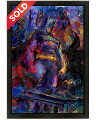 The night is dark, and Batman surveys Gotham.  The city is riddled with crime, robbers and the underground mafia run these streets.  The Dark Knight fights to save the people from the endless torment and corruption these criminals bring.  This original oil on canvas painting depicts the Batman, standing above watching and protecting the people of this once fair city with whatever it takes.