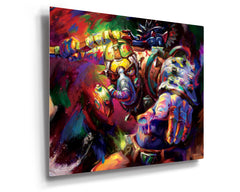 Krieg means War. His mind is fractured with dueling personalities. His reasonable inner voice struggles to control his psychotic and bloodthirsty side from harming innocents and targeting those who deserve it. Krieg’s craziness, power and strength could not be contained within the canvas borders. In Blend’s action-packed limited edition metal print of Krieg, the killing machine is literally jumping out through splashing colors.