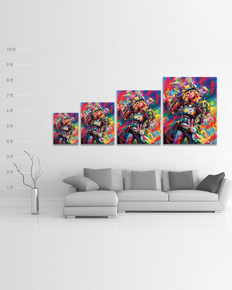 The explosive Tiny Tina, so young and unstable, so pretty and chaotic, a destructive twisted personality that enjoys blowing things up. Blend’s funky limited edition metal print of Tiny Tina is as explosive as her character, treated with large free flowing brushstrokes and bright happy colors. A perfect fit for this whimsical creature of the wastelands.